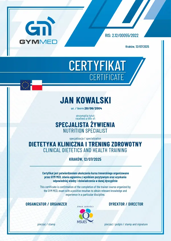 Po zaliczeniu testu końcowego otrzymasz imienny certyfikat potwierdzający zdobyte umiejętności i wiedzę. Certyfikat wystawiany jest przez akredytowaną placówkę szkoleniową GymMed, co zwiększa jego wartość na rynku pracy.
